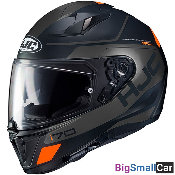 Аэродинамический мотоциклетный шлем HJC i70 с визором широкой обзорности и традиционным для шлемов HJC встроенным солнцезащитным визором.